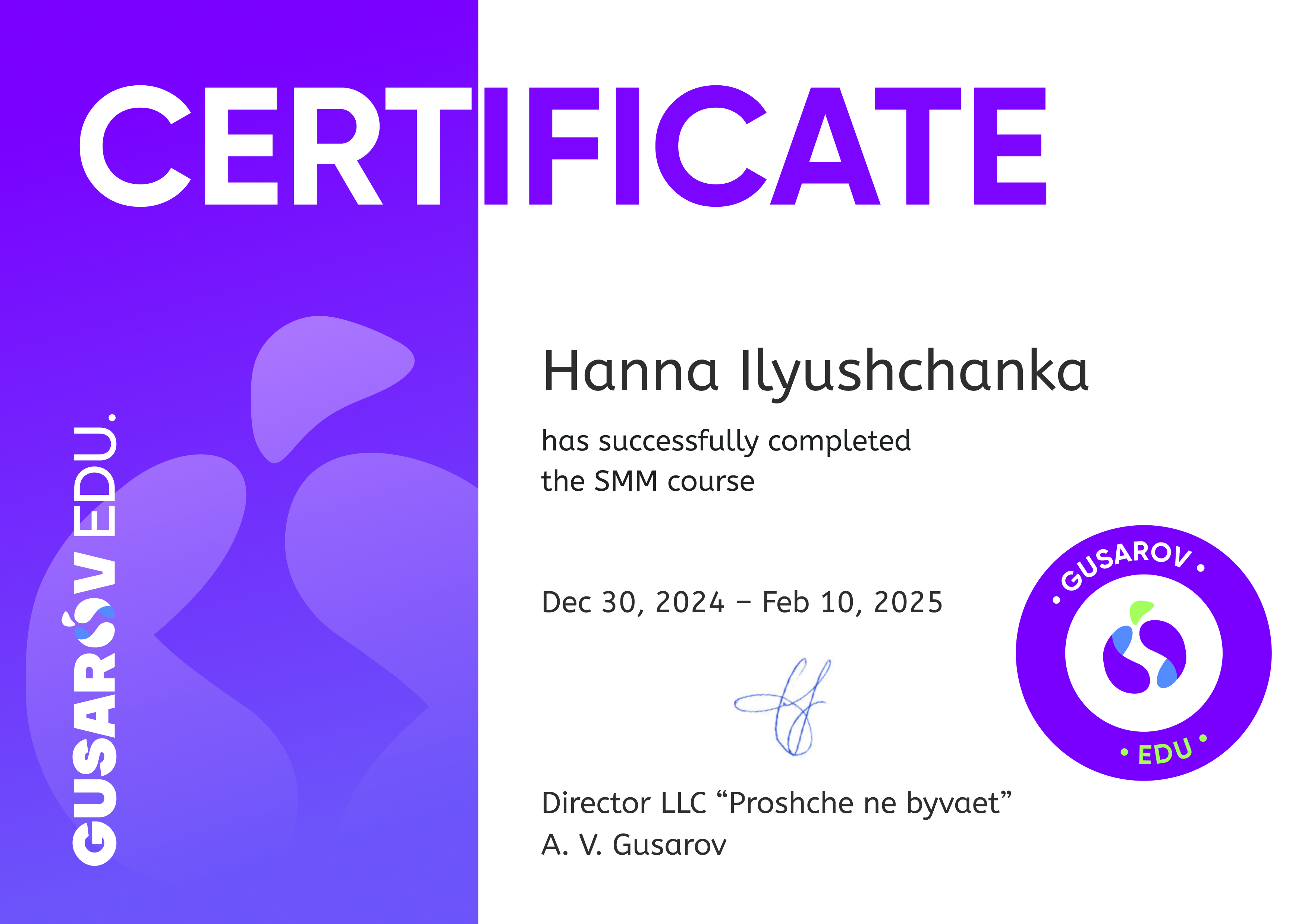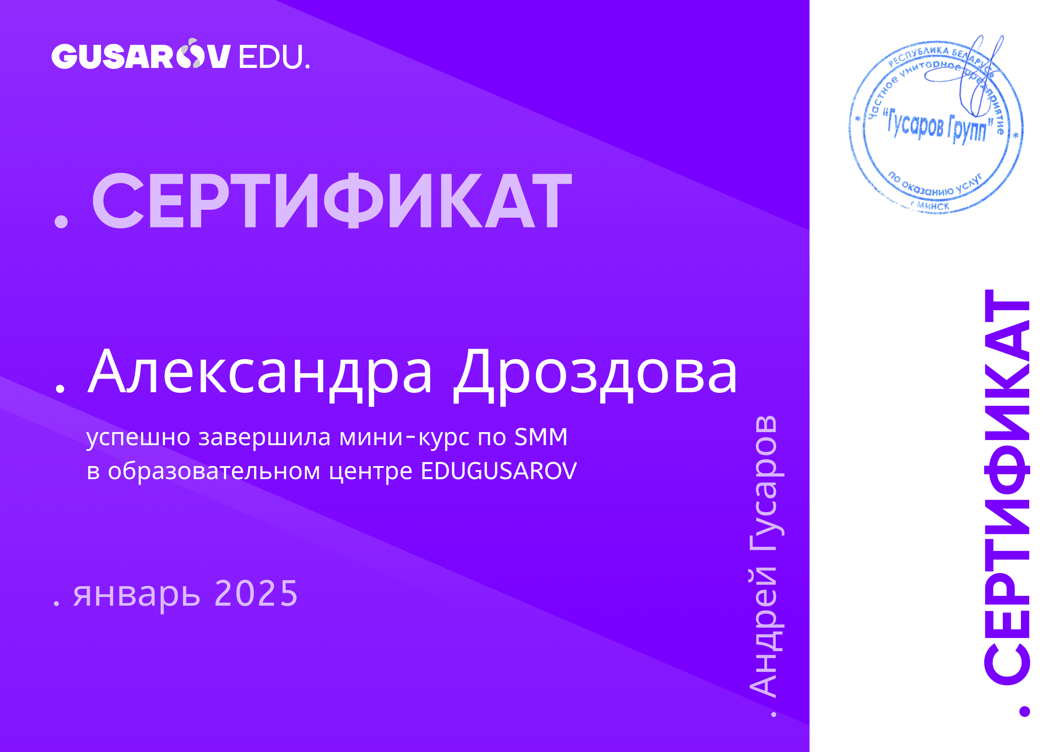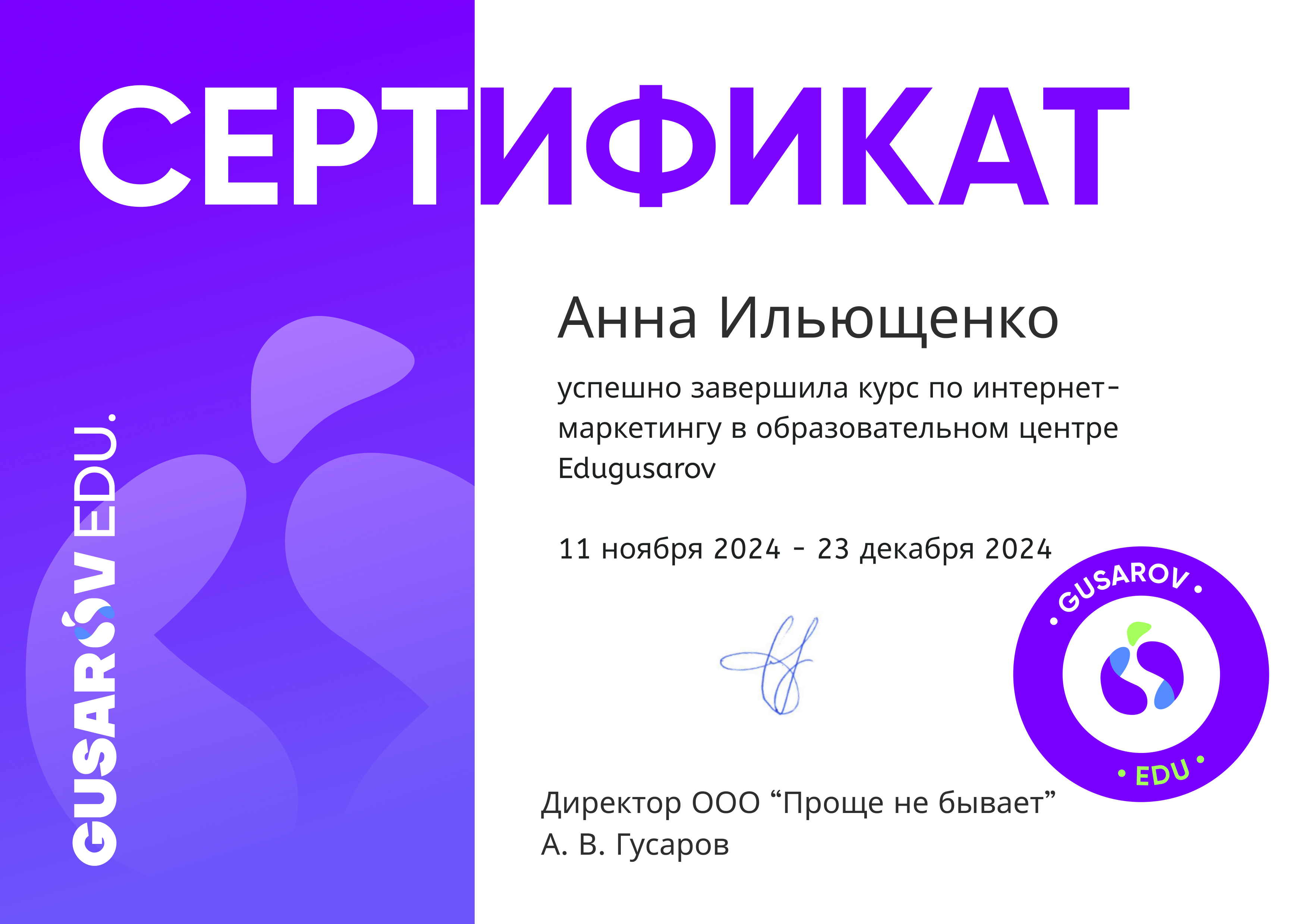 Здравствуйте! Хочу написать о самом важном событии первой половины 2024 года. Этим событием является обучение на курсах по интернет-маркетингу и SMM в замечательном образовательном центре EDUGUSAROV. Я выбирал между многими, но никто не смог меня так зацепить как они. С самого начала я общался с превосходным селлером Кристиной Атрачевой, она постепенно меня вела к покупке курса, что ей в итоге и удалось, она выявила все мои потребности,обработала все мои возражения и и отлично завершила сделку. Хочу отметить замечательную игру Шерлок, которая вместе с Кристиной вела к скорейшей покупке курса. А самой главной изюминкой оказалось Колесо фортуны на самом сайте EDUGUSAROV. Благодаря Колесу фортуны я выиграл приличную скидку на курс и уже не мог сопротивляться дальше. Я подписался на Андрея Гусарова в Тик-Ток, Instagram. Благодаря его активности в этих соцсетях я понял, что маркетинг это очень интересно, совсем не скучно и самое главное, я понял, что это именно то чему я хочу обучаться и дальше связать свою жизнь с этим. Тик-Ток Андрея это вообще мегамотивирующая вещь! Очень понравилось, что на курсе интернет-маркетинга был преподователем сам Андрей. Он лично проводил эфиры, лично проверял домашние задания. И ты это очень ценишь, понимая, что Андрей собственник большого маркетингового агенства, но он находит на тебя время и силы. А теперь перейдем к моей главной благодарности в этом отзыве. Курс по SMM вел замечательный преподаватель Юлия Казаровец. И тут я понял, что готов ее слушать часами, я смотрел все разборы уроков, я был на всех эфирах с ней. Она просто влюбляет тебя в то, о чем рассказывает. Именно она меня влюбила в таргетированную рекламу. Я смотрел не уставая уроки с ней на эту тему. Обаятельная, умная, рассказывающая все доходчиво и простым языком. Спасибо вам всем в этой замечательной команде кто принимал участие в моем обучении. Отдельное спасибо Кристине, Шерлоку, Андрею и Юлии. У меня уже есть клиенты. Двоим я делаю таргетированную рекламу, а одного клиента полноценно взял на SMM. А это значит, что курсы действительно крутые и ты можешь сразу найти клиентов и работать на полную. Спасибо EDUGUSAROV!